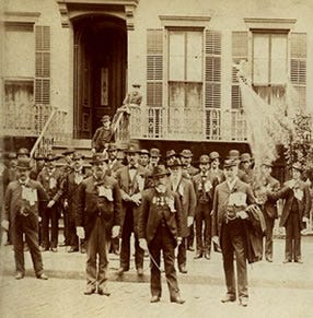 (General George Molineux, center, with some of his Civil War unit in front of his home on Fort Greene Place, 1884)