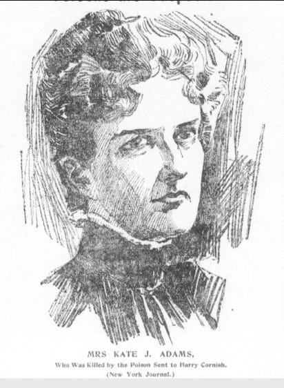 A year later, on Christmas Eve of 1898, Cornish received a small box in the mail containing a silver toothpick holder with a small blue bottle of Bromo Seltzer crystals inside. There was no note with the package, but Cornish kept the address paper, in which the word “forty” in the street address was spelled “fourty”. A couple of days later, his landlady, Katherine Adams, complained of a headache. Cornish took the Bromo Seltzer, mixed up a dose with water, gave it to his landlady, and a few minutes later, she was violently stricken and moments later, dead.
