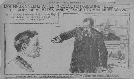 Did Roland Molineux kill Henry Barnet and Katherine Adams? Circumstantial evidence and public opinion certainly point in that direction. During the first trial, if the prosecutor had not tainted his case by pulling in Henry Barnet's death, would the jury have been as convinced by the handwriting evidence and the other witnesses? Should they have charged Molineux for the Barnet death first, and then added the Adams death? Would they have been able to, as one led to the other, but the second was only investigated because of the first? Sounds like an episode of Law and Order. We'll never know for sure.